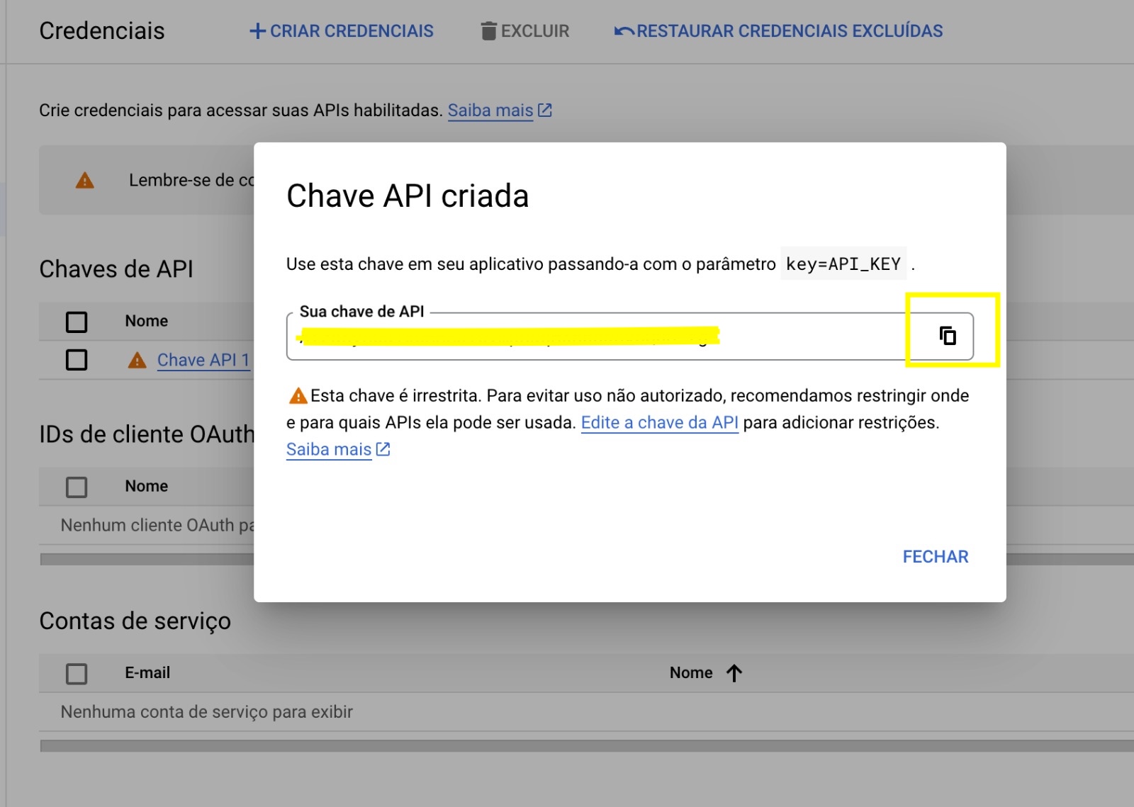 3.Insira a chave de API que você copiou e salvou no campo apropriado.