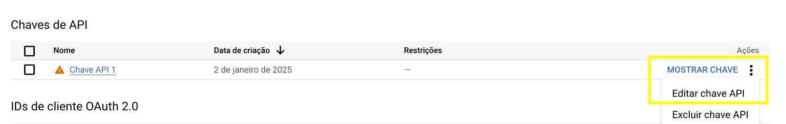 •Clique nos três pontinhos ao lado da chave API criada e em seguida clique em "editar chave API"