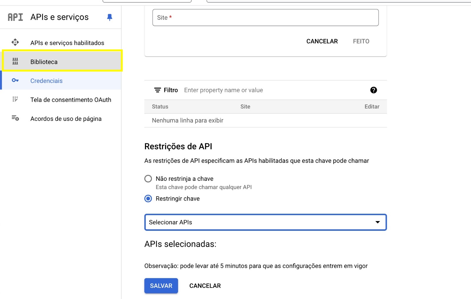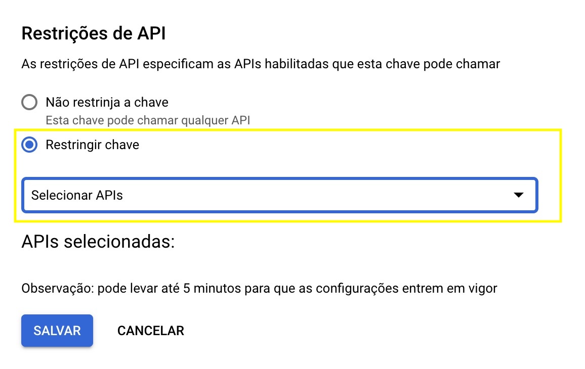 3.Em Restrições de API, selecione "restringir chave" e em seguida selecione as APIs que você ativou anteriormente (ex.: Maps JavaScript API, Geocoding API, etc.).
