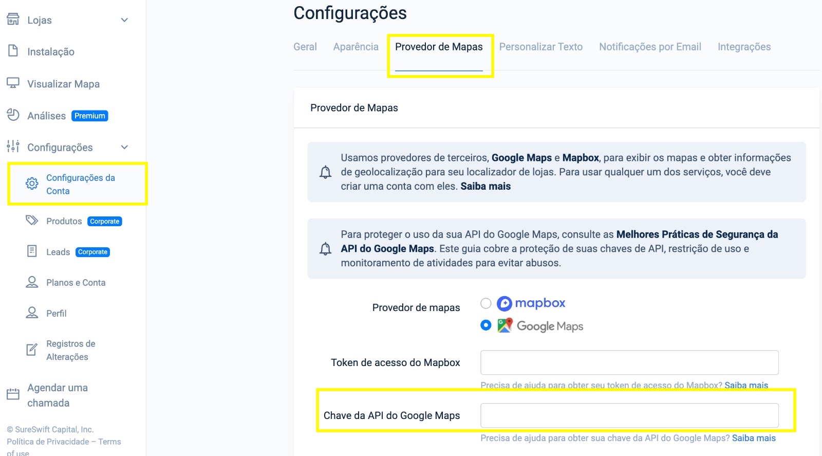 O Storemapper trabalha com a plataforma Google Maps para garantir que seus clientes tenham a melhor experiência de mapa possível. Como esse mapa está no seu site, disponível publicamente, e seus clientes o utilizam livremente, você precisará estabelecer seu próprio relacionamento com o provedor de mapas (neste caso, o Google). Isso envolve a criação de uma conta com eles e a geração de uma chave de API ou token vinculado ao seu mapa e site.